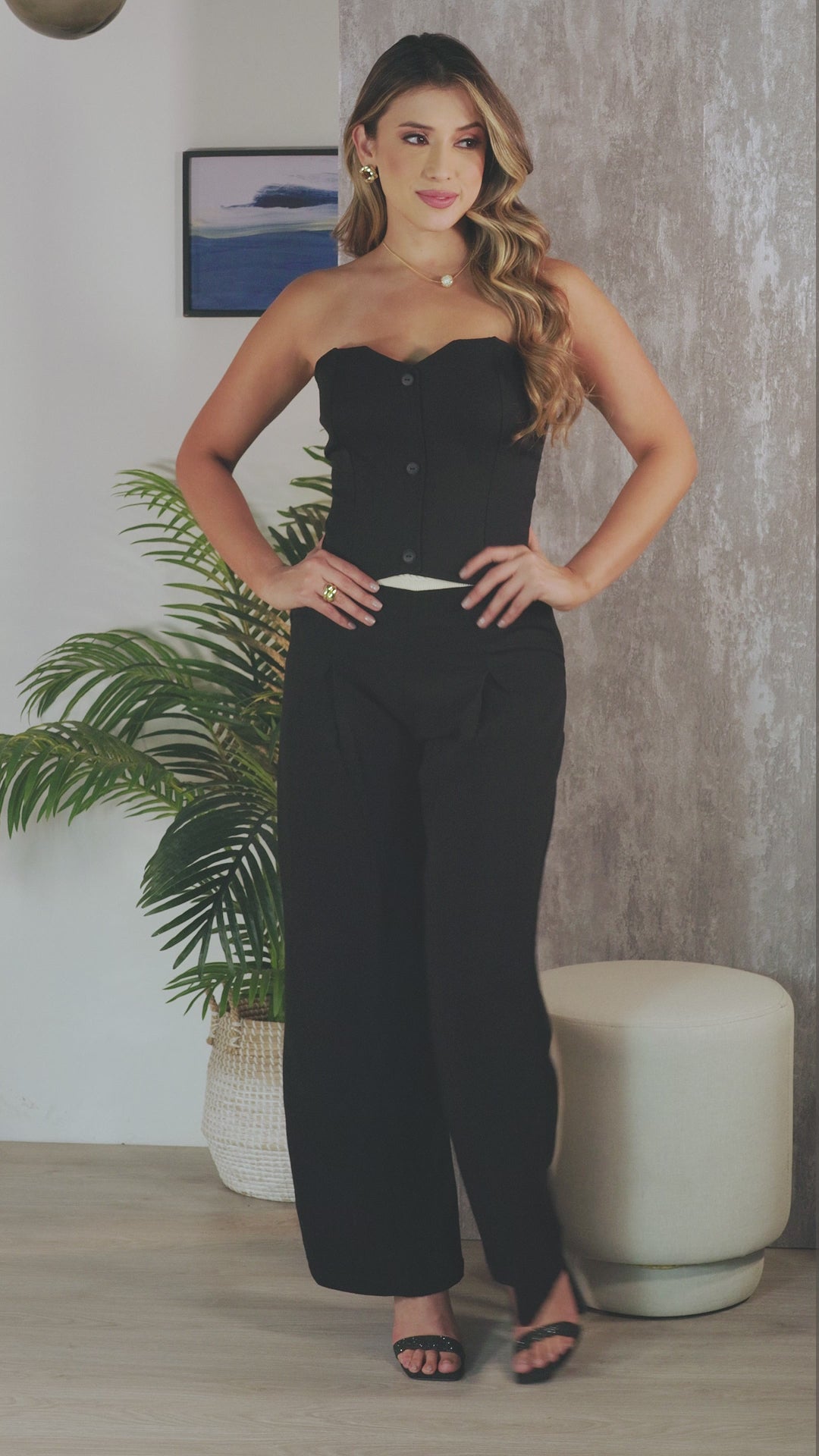 Este corset strapless con botones frontales es la definición de elegancia con actitud. Su corte estructurado realza la silueta y el escote en forma de corazón añade un toque femenino y sofisticado.