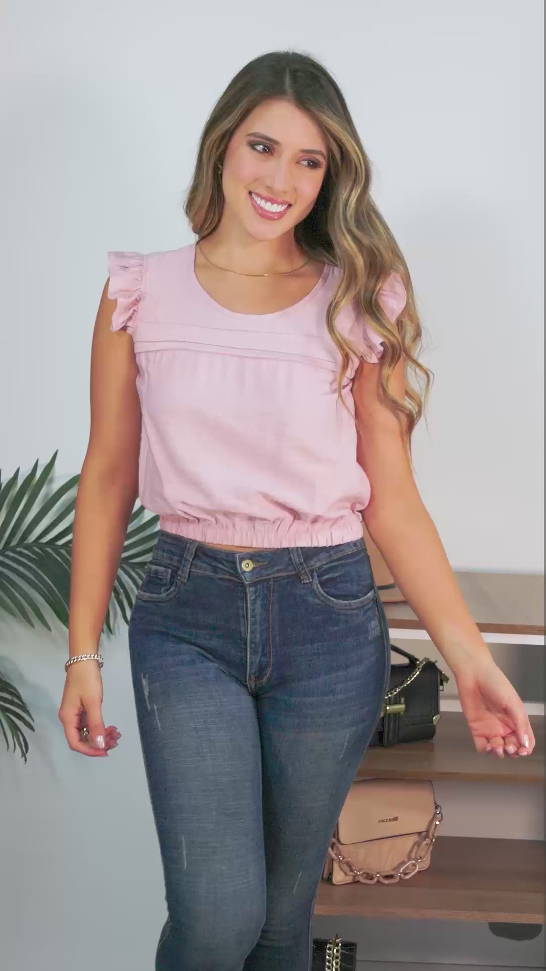 Fresca, femenina y muy cómoda. Esta blusa con delicados vuelos en las mangas y elástico en la cintura resalta tu silueta de forma sutil y natural.