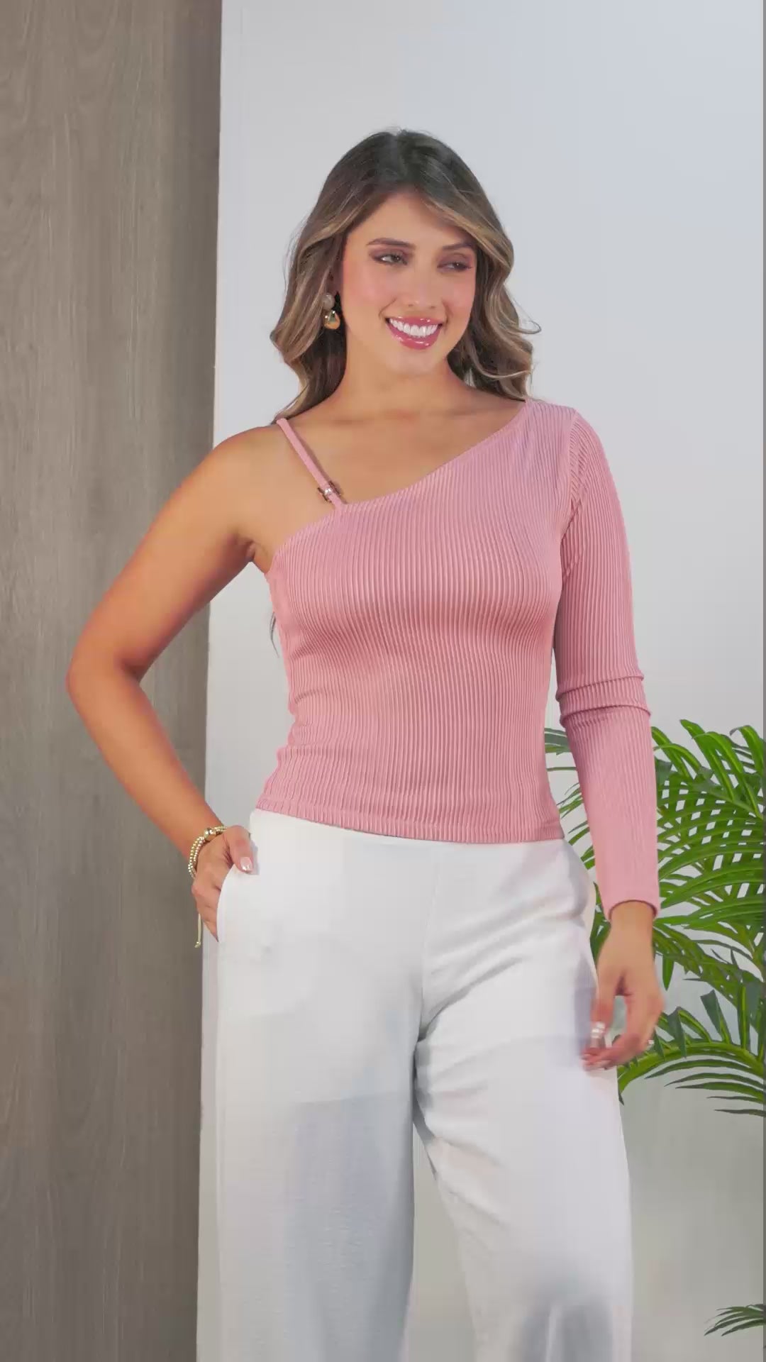 Moderna y con actitud, esta blusa de una sola manga y tirante decorativo es perfecta para destacar con un look diferente y femenino. Su textura acanalada se ajusta suavemente al cuerpo, brindando comodidad y estilo.