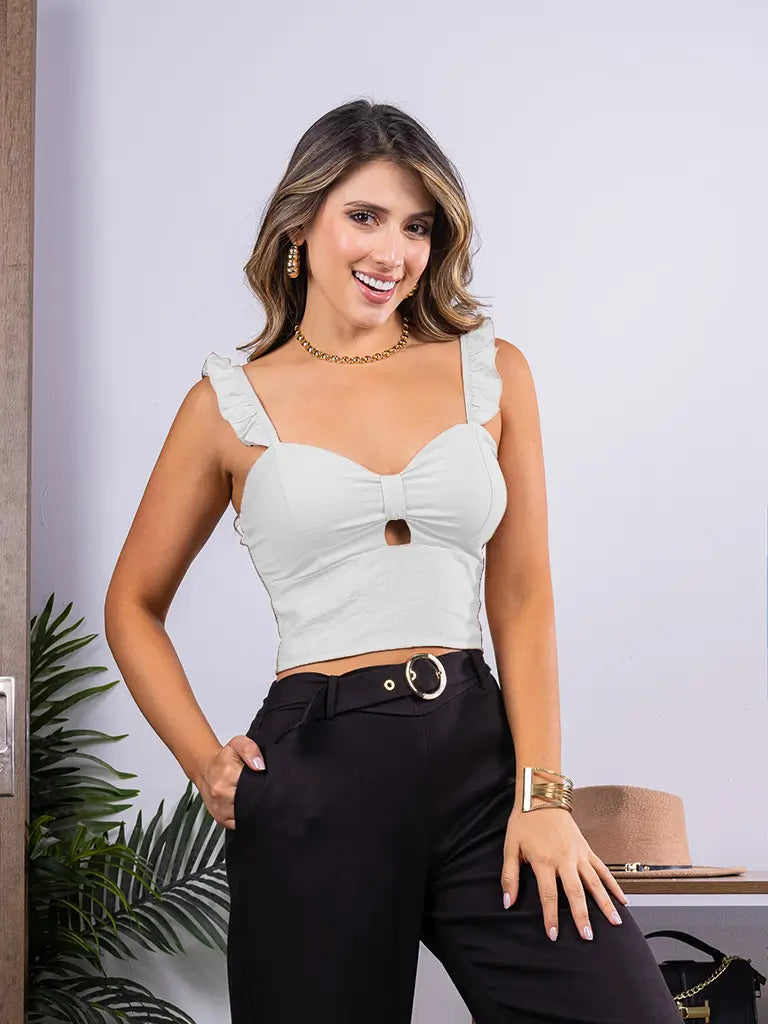 Blusa de tiras finas con vuelos y escote corazón es la mezcla ideal entre coquetería y sofisticación. El pequeño detalle de abertura frontal le da un toque moderno y femenino que realza el busto de manera sutil.