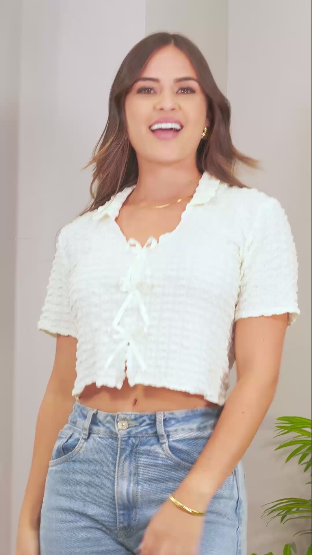 Esta blusa corta con textura y delicado amarre frontal es perfecta para darle un toque romántico y moderno a tu outfit. Su cuello tipo camisero y manga corta hacen que sea una prenda fresca y versátil para combinar con jeans, faldas o pantalones de tiro alto.