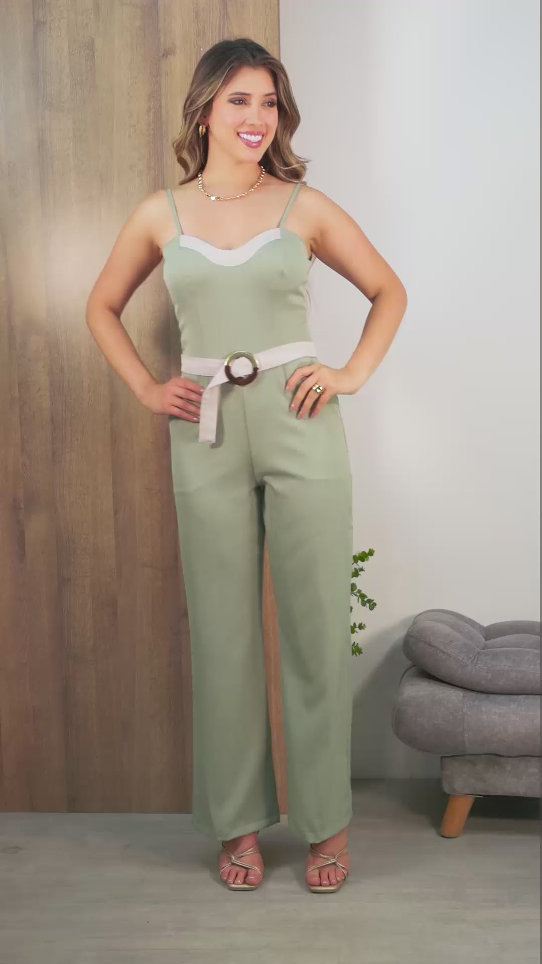 Este enterizo de tirantes delgados combina un diseño estilizado con una silueta que alarga visualmente la figura. Su ajuste suave y ligera estructura crean un look sofisticado, mientras que el cinturón con hebilla decorativa resalta la cintura y añade un toque distintivo y moderno.
