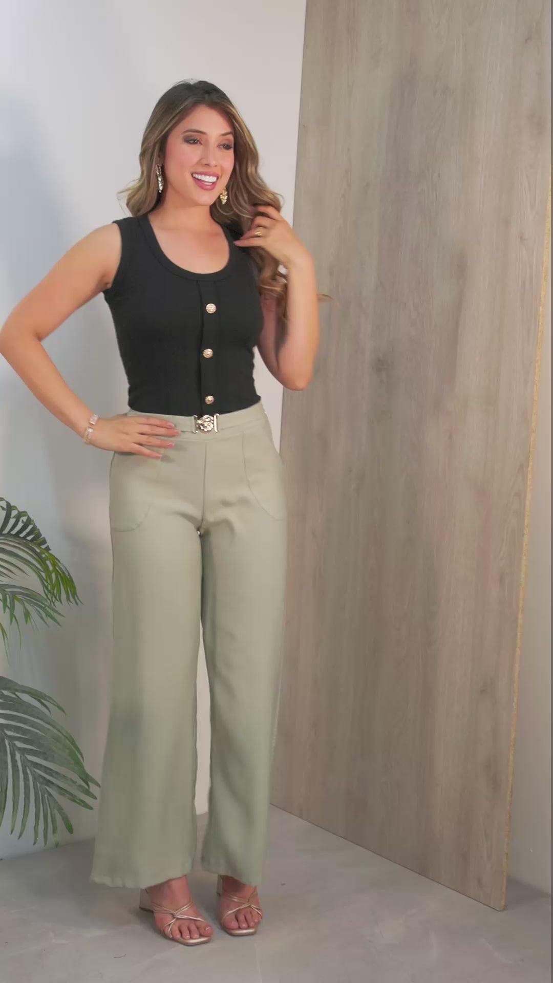 Este pantalón de silueta amplia ofrece una caída ligera que estiliza y aporta comodidad durante todo el día. Su diseño de tiro medio y cintura con detalle decorativo añade un toque sofisticado, mientras que sus bolsillos funcionales lo convierten en una prenda práctica y versátil.