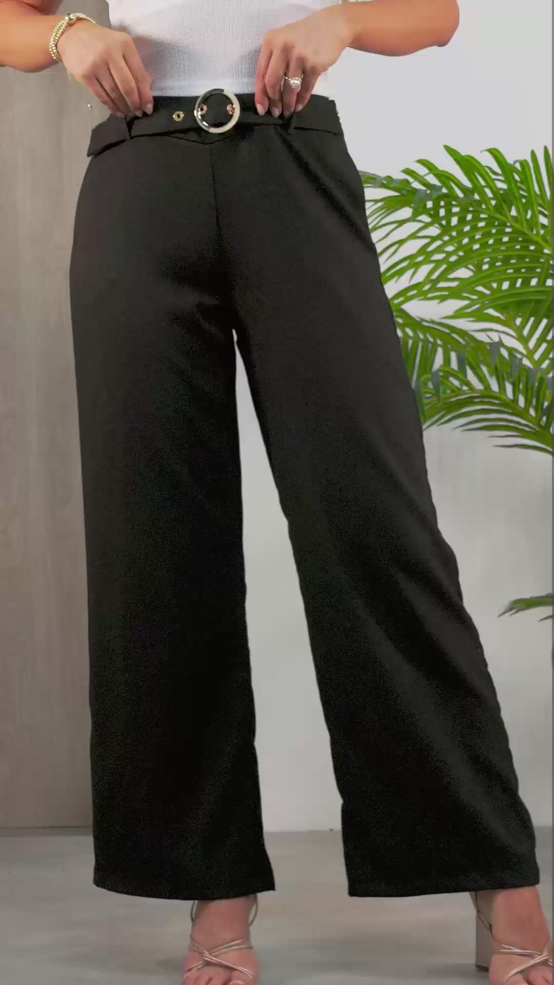 Este pantalón de tiro alto con corte recto y cinturón decorativo dorado es una pieza clave para lograr un look sofisticado y cómodo. Su silueta favorecedora y tela fluida lo hacen perfecto para múltiples ocasiones.