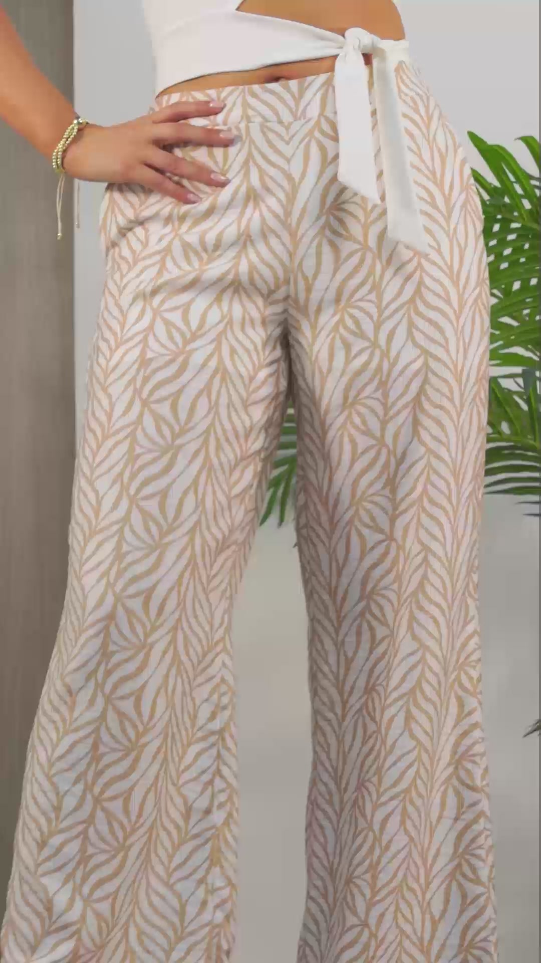 Este pantalón wide leg es el equilibrio perfecto entre frescura y estilo. Con un diseño de hojas sobre fondo claro, aporta un aire natural y relajado ideal para los días cálidos. Su corte amplio y pretina ancha favorecen la silueta y brindan una comodidad inigualable.