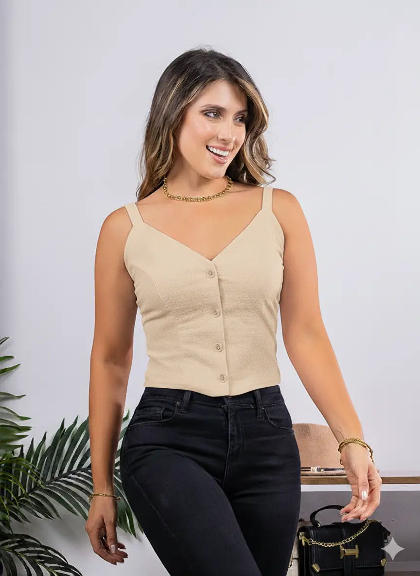 Delicada y versátil, esta blusa con tiras gruesas, botones al frente y textura sutil es ideal para looks frescos con un toque romántico. Su corte entallado favorece la silueta y la convierte en una prenda fácil de combinar.